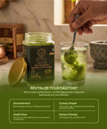 The deep emerald hue is proof of high chlorophyll and polyphenol content. It acts as a natural detoxifier, cleansing your system from the inside out.